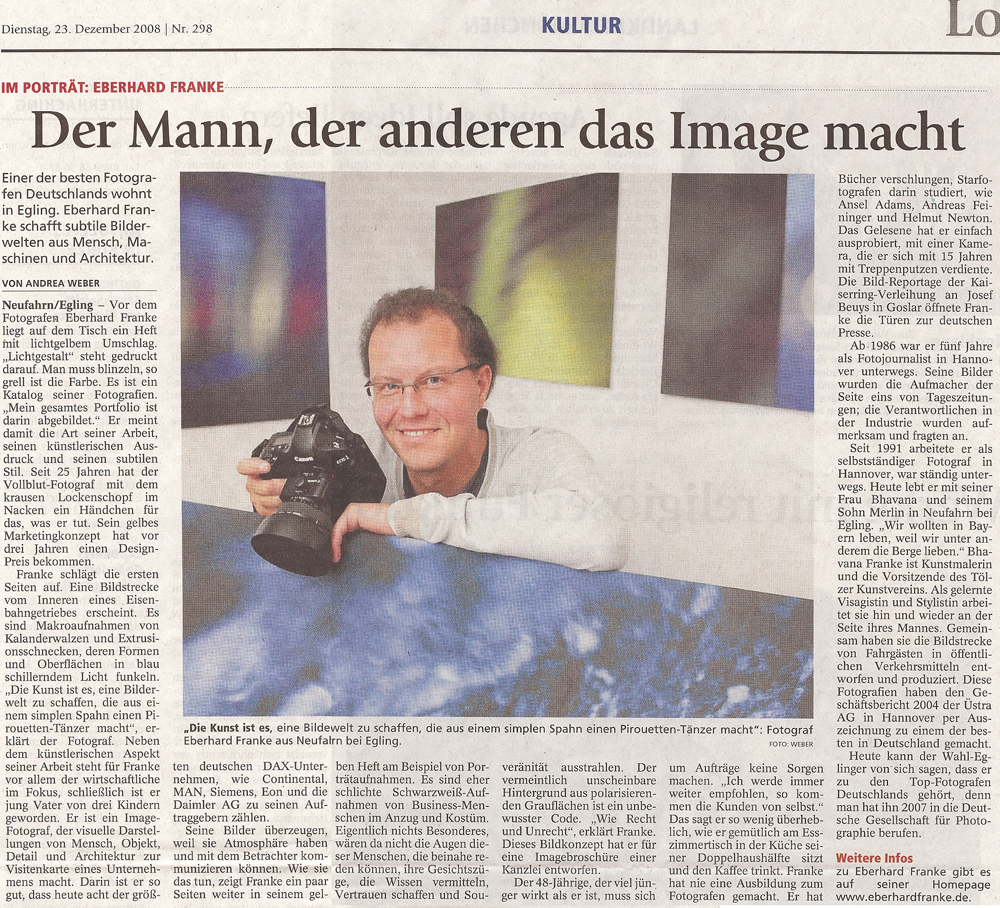 INHALT: Einer der besten Fotografen Deutschlands wohnt in Egling. Eberhard Franke schafft subtile Bilderwelten aus Mensch, Maschinen und Architektur.