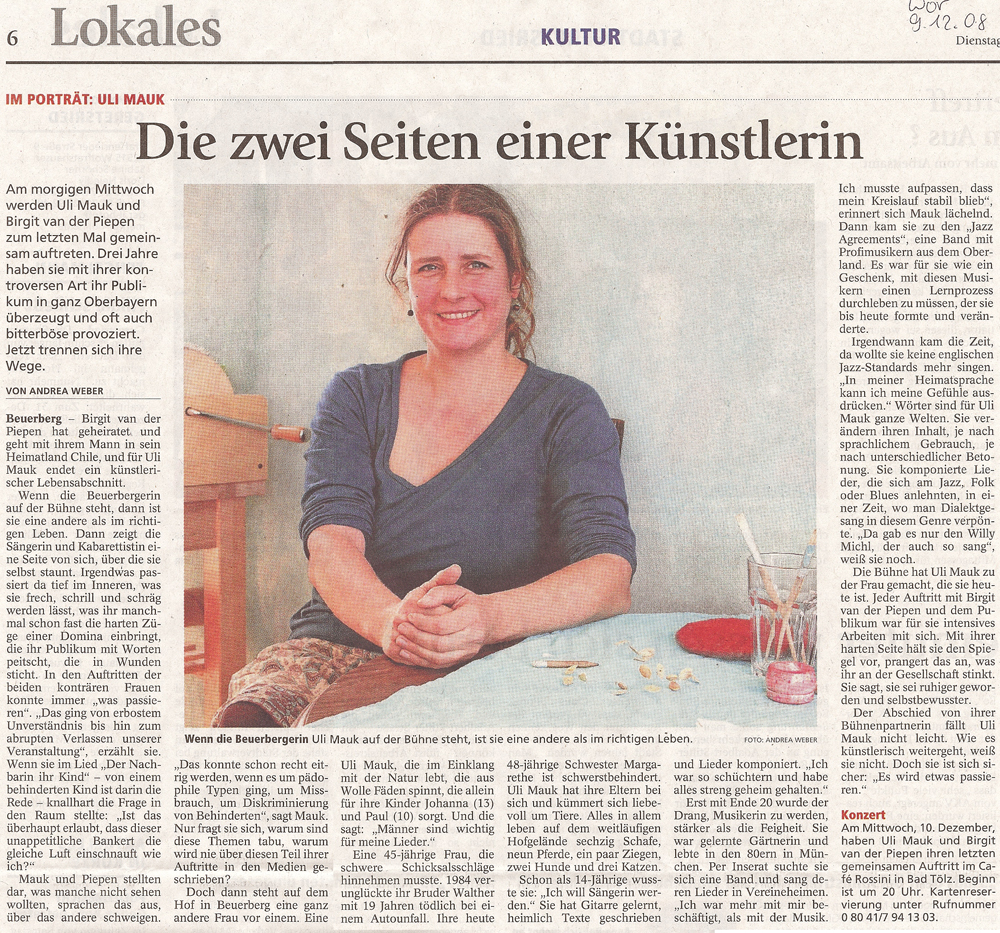 INHALT: Uli Mauk und Birgit van der Piepen treten zum letzten Mal gemeinsam auf. Drei Jahre haben sie mit ihrer kontroversen Art ihr Publikum in ganz Oberbayern überzeugt und oft bitterböse provoziert. Download Original-Artikel