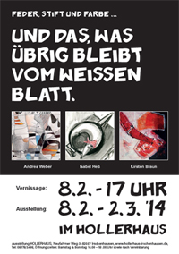 Isabel Heß arbeitet dynamisch, kraftvoll, frech und sprichwörtlich schwarz auf weiß. Kirsten Brauns Bilder sind Farbverhandlungen, sie bringt Ordnung ins Chaos, sie lässt Spannung durch Gegensätze entstehen. Und Andrea Webers filigrane Figurenwelt aus zartem Bleistift und weichem Aquarell ist exakt und doch verspielt, ist offensichtlich und doch versteckt.