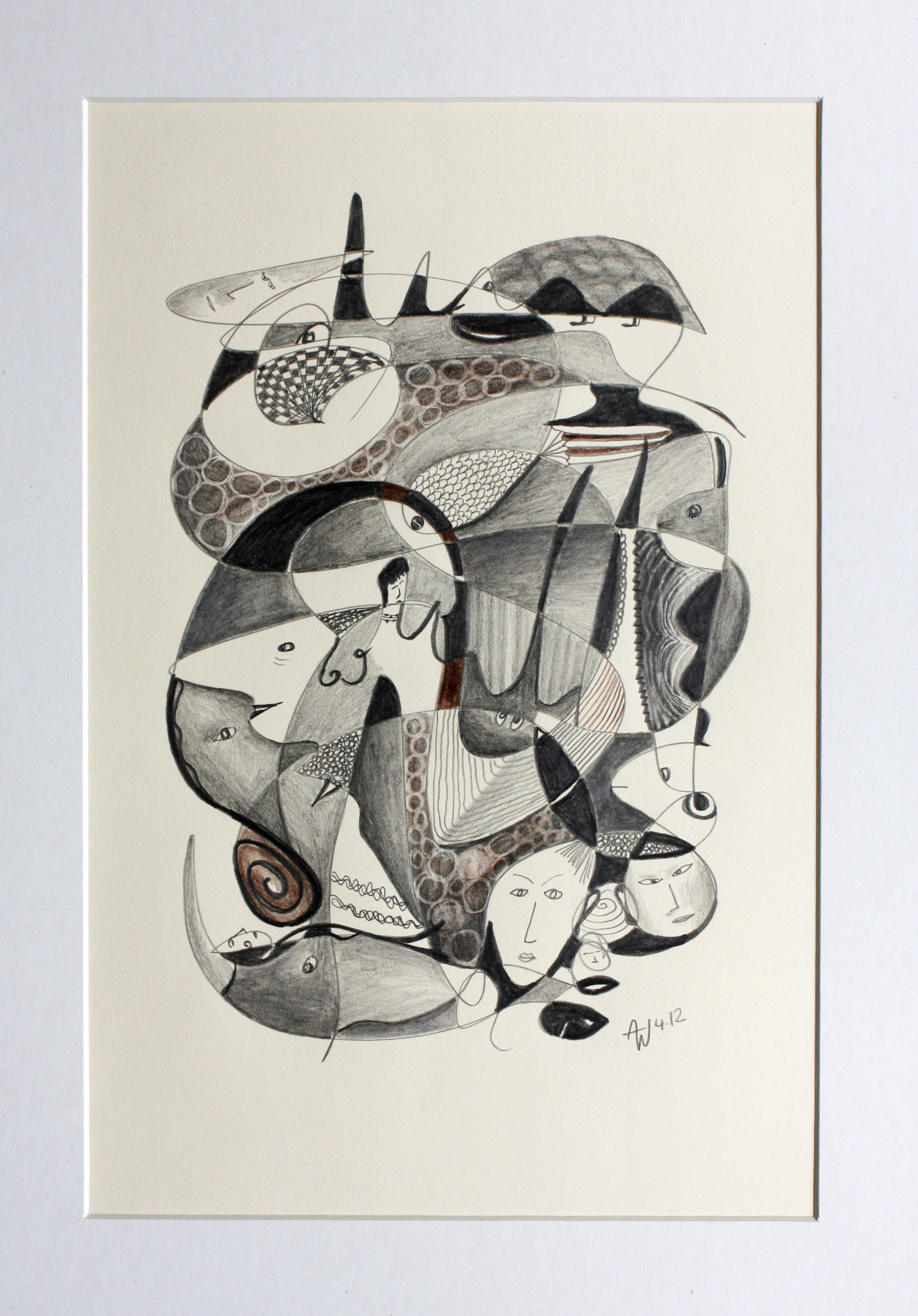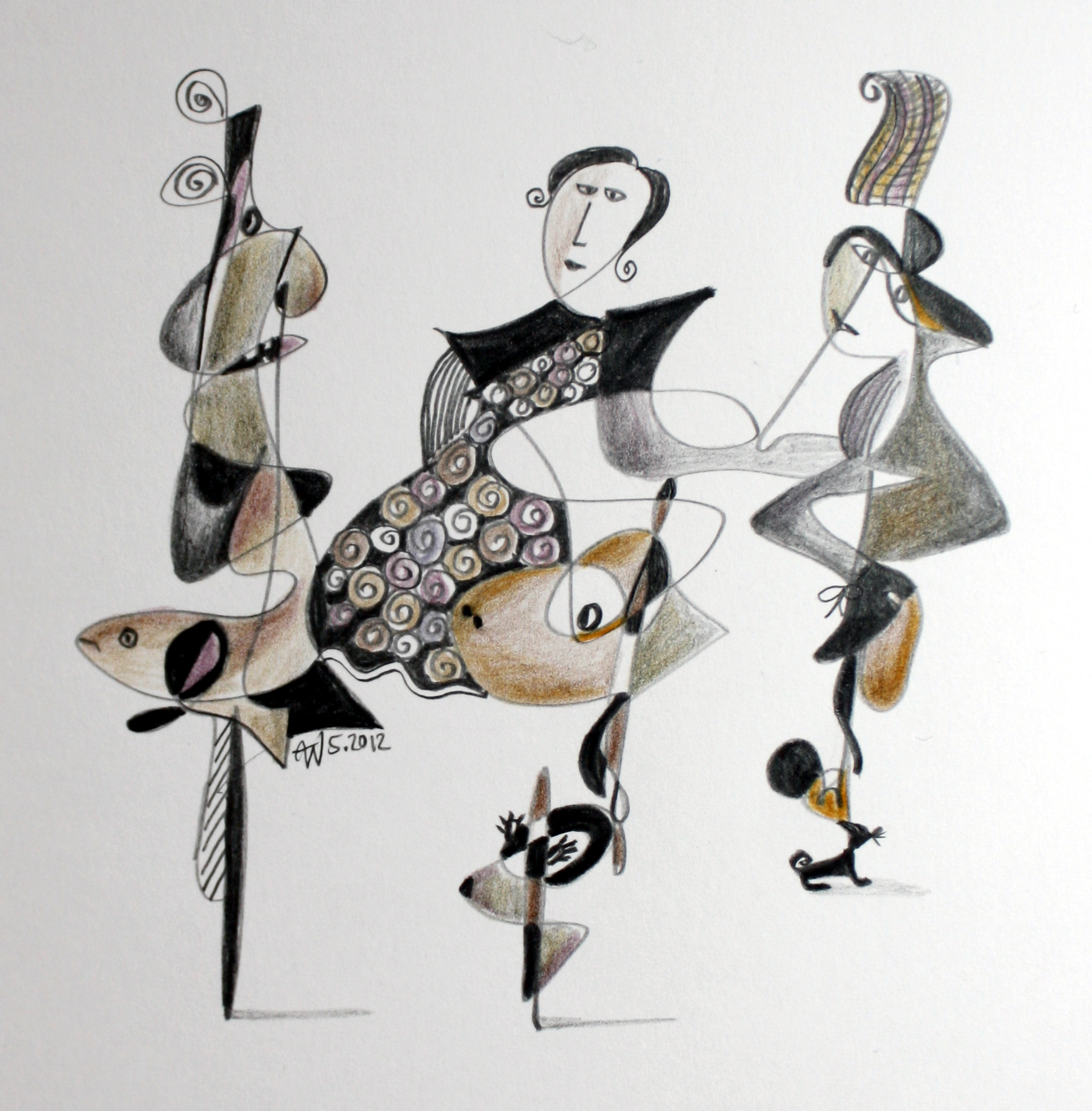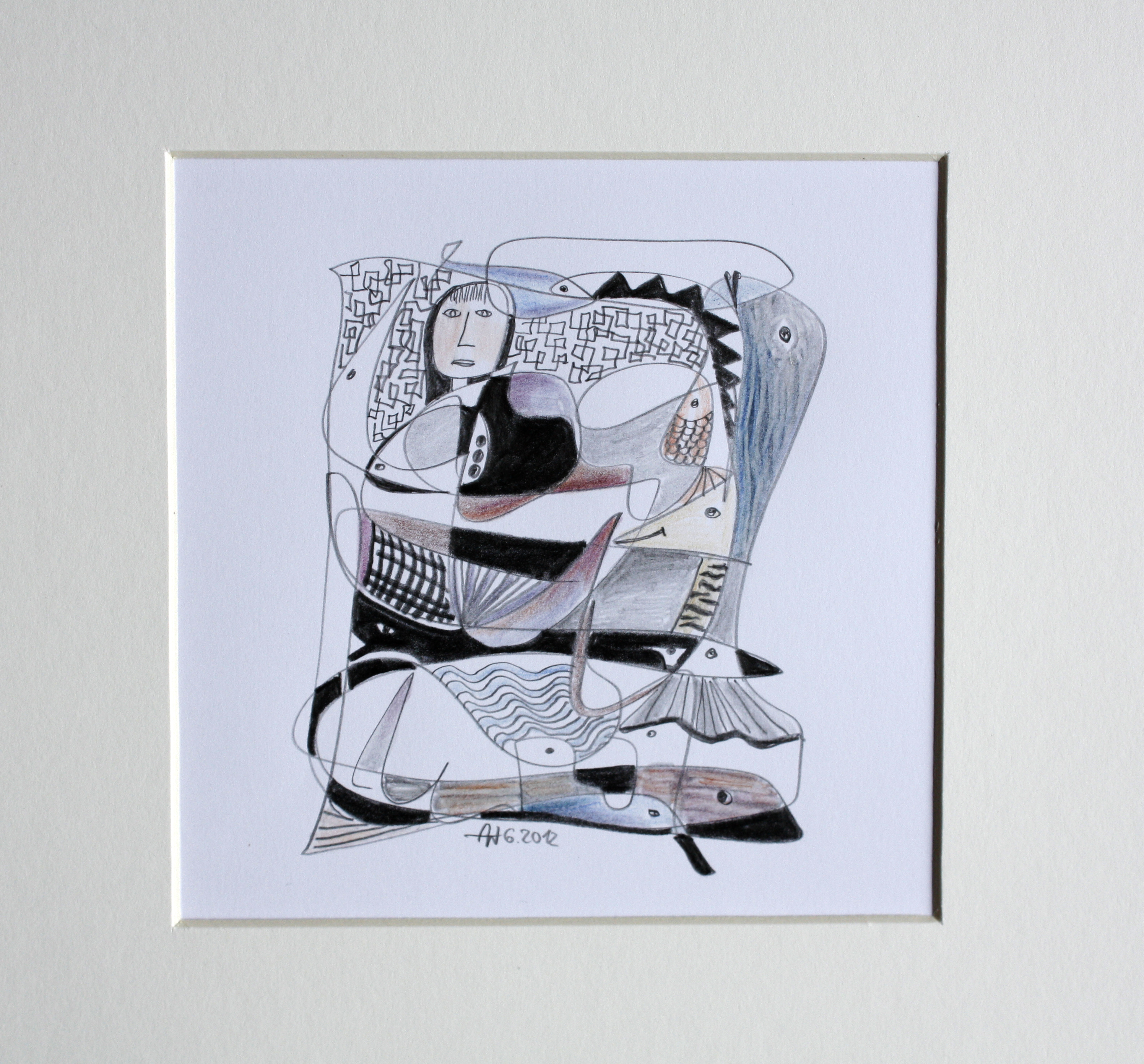 Manchmal sind es drollige Wesen, manchmal freche Gesichter, manchmal bissig aber nie böse. Manchmal sind es niedliche Tiere - Katzen, Fische oder Vögel. Sie scheinen selbst zu bestimmen, wann und wer beim Zeichnen entstehen will. Daher ist jedes Bild ein Unikat. Die Zeichnungen sind nicht sichtbar signiert, denn bei jeder Drehung erscheinen neue Wesen. Und jeder Betrachter sieht seine eigenen darin.