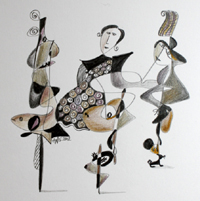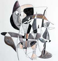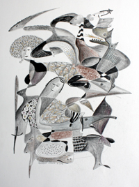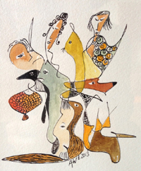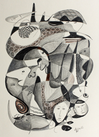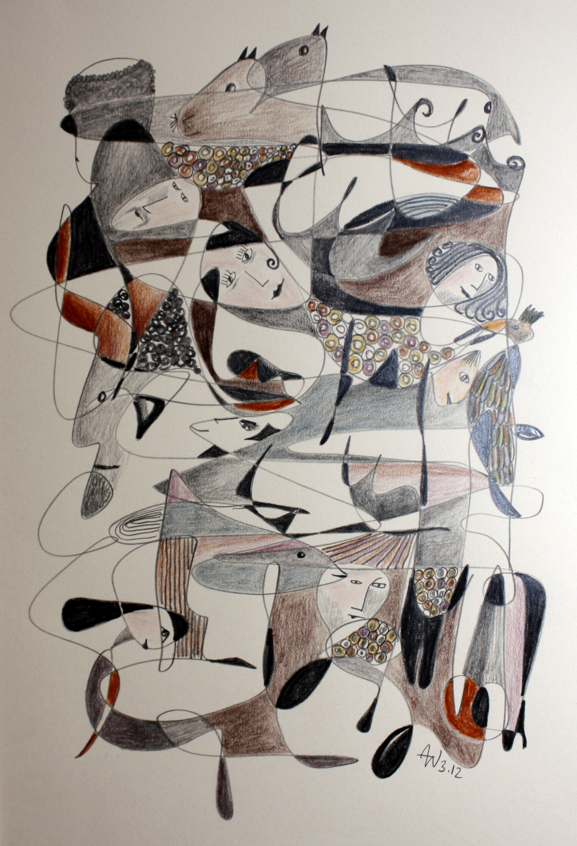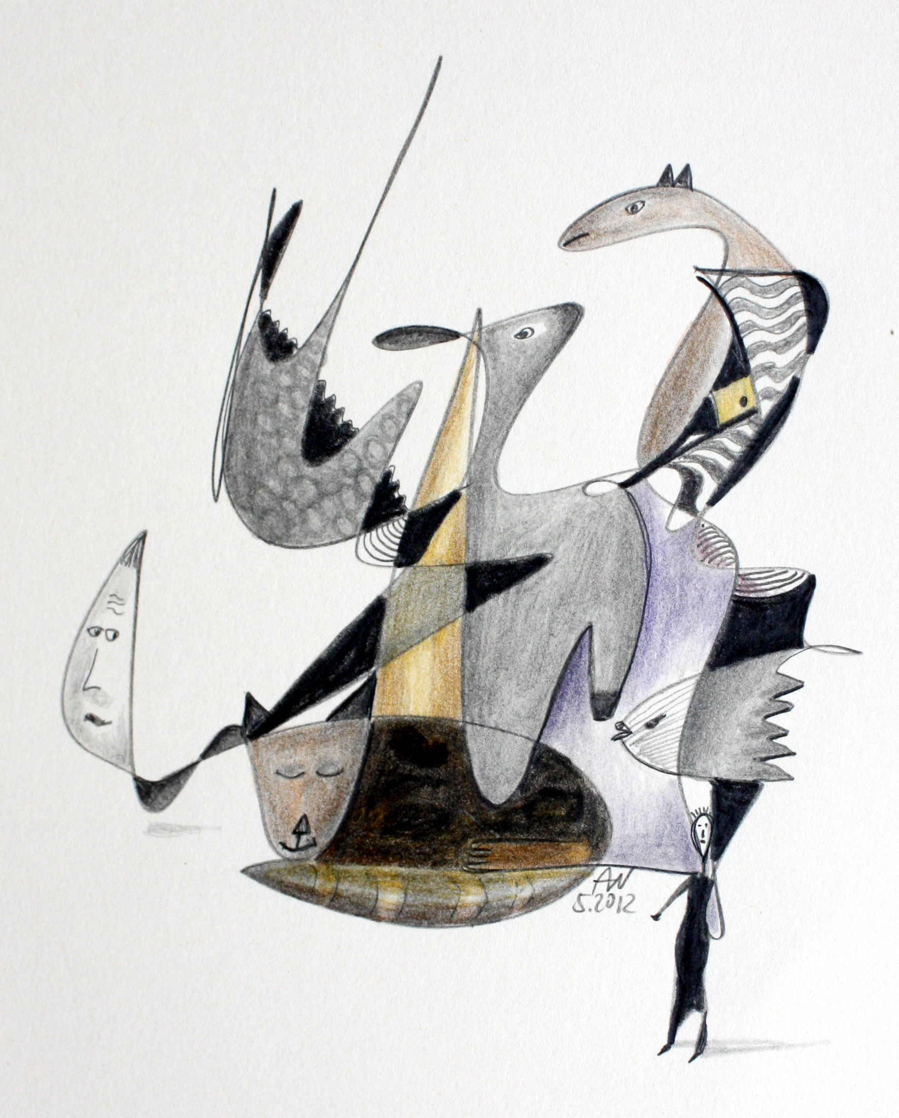 Manchmal sind es drollige Wesen, manchmal freche Gesichter, manchmal bissig aber nie böse. Manchmal sind es niedliche Tiere - Katzen, Fische oder Vögel. Sie scheinen selbst zu bestimmen, wann und wer beim Zeichnen entstehen will. Daher ist jedes Bild ein Unikat. Die Zeichnungen sind nicht sichtbar signiert, denn bei jeder Drehung erscheinen neue Wesen. Und jeder Betrachter sieht seine eigenen darin.