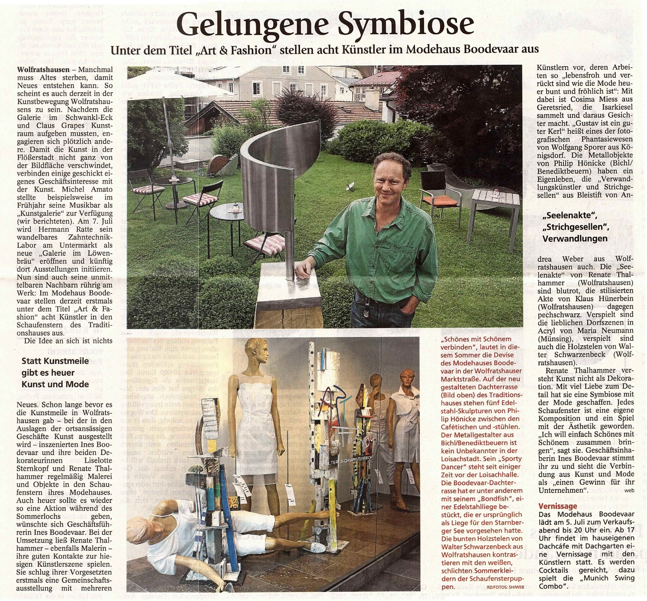 Pressestimme zur Ausstellung im Modehaus Boodevaar in Wolfratshausen am 5. Juli 2012 mit sieben anderen Künstlern. Münchner Merkur (Lokalteil Isar-Loisachbote) Gelungene Symbiose (20.06.2012)